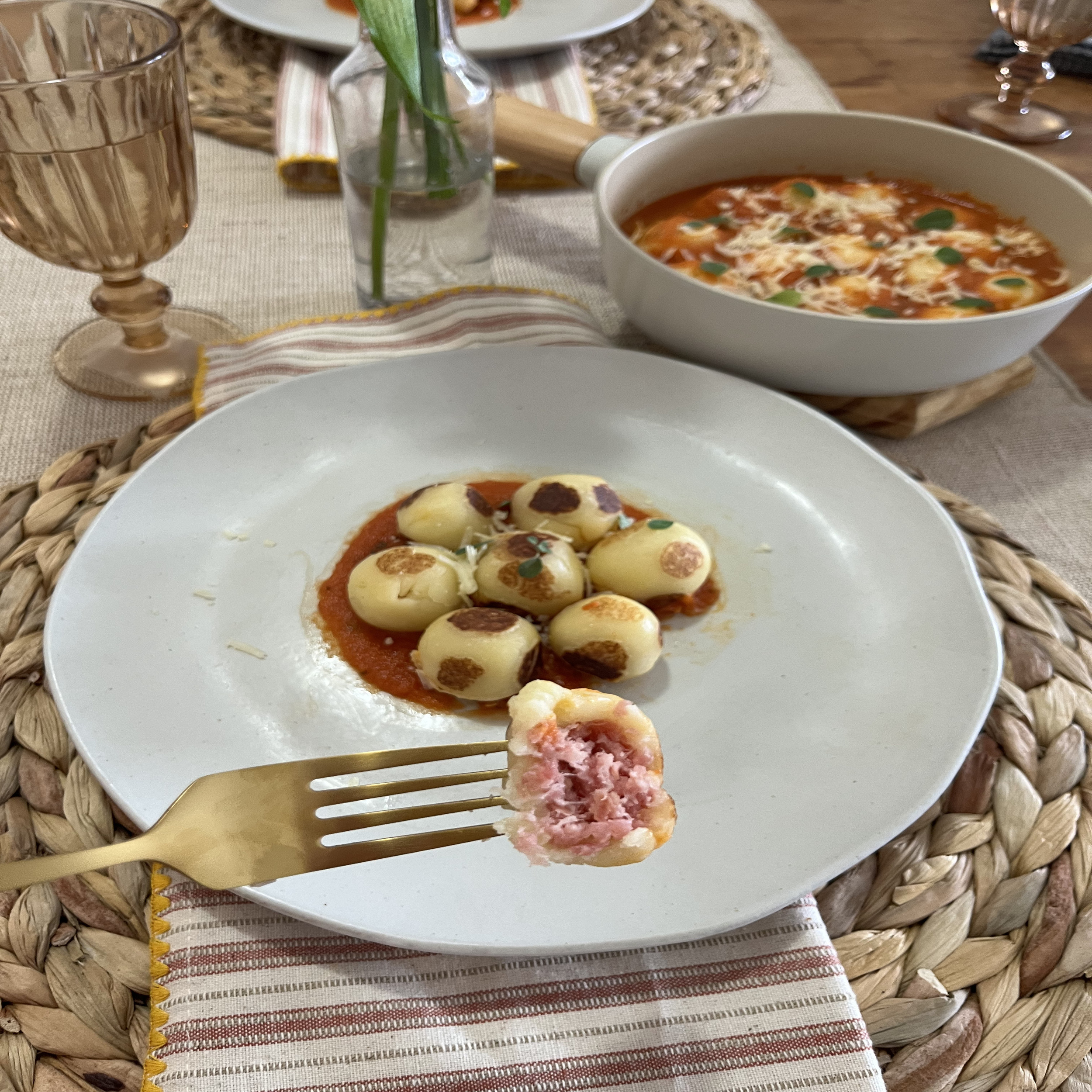 Experimente nosso Nhoque Recheado, macio por fora e surpreendente por dentro! Cada pedaço é recheado com saborosa e regional Linguiça Blumenau. Peça já!